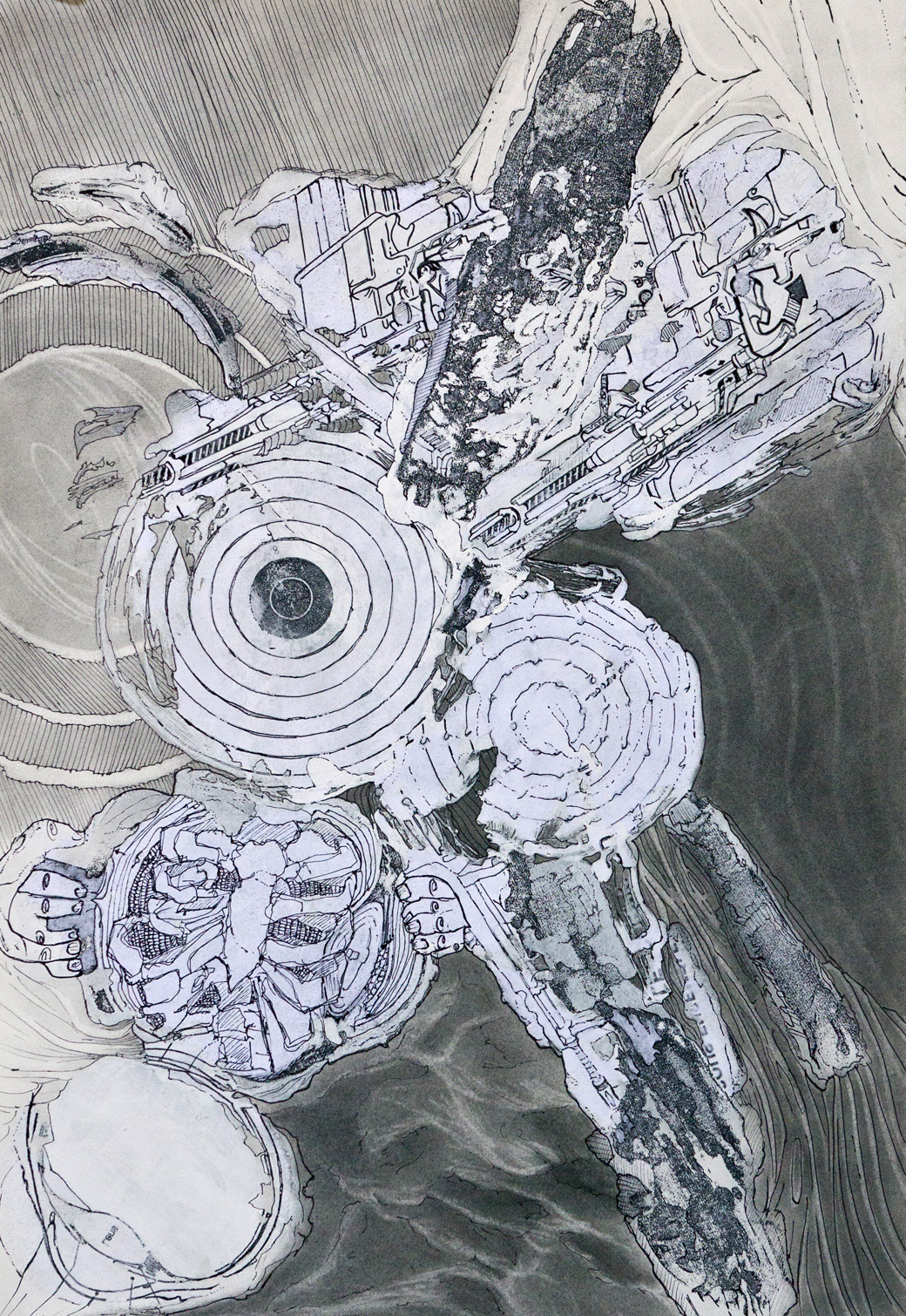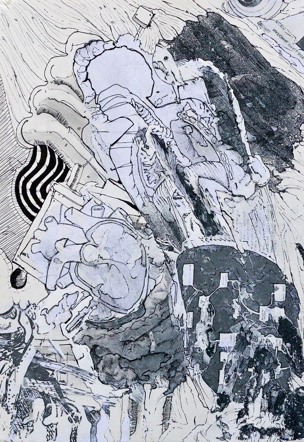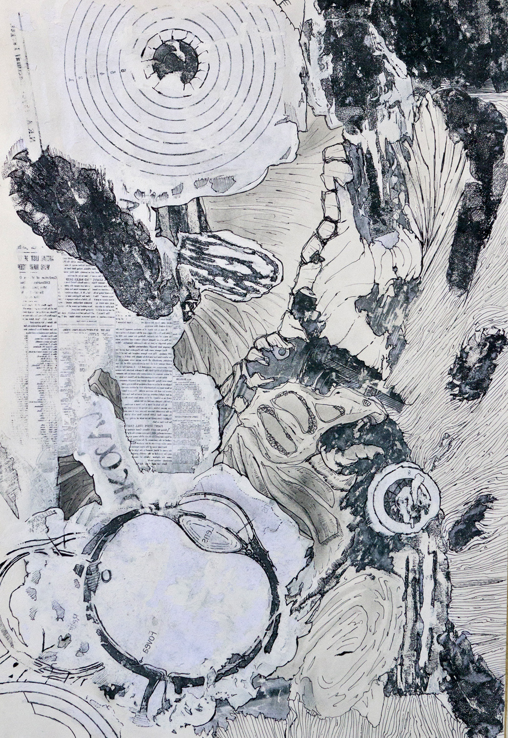 These drawings were created using a variety of mediums including graphite powder, ink, white gesso, print transfers, and charcoal on Stonehenge paper.