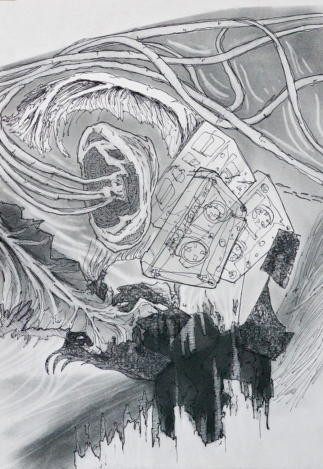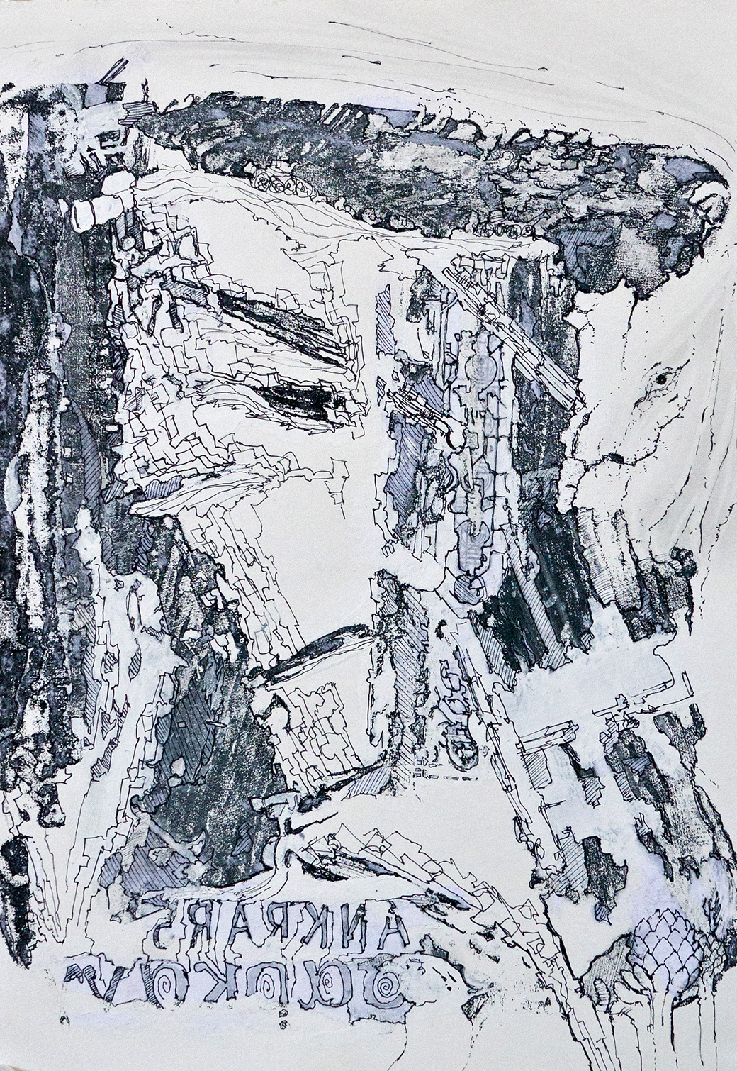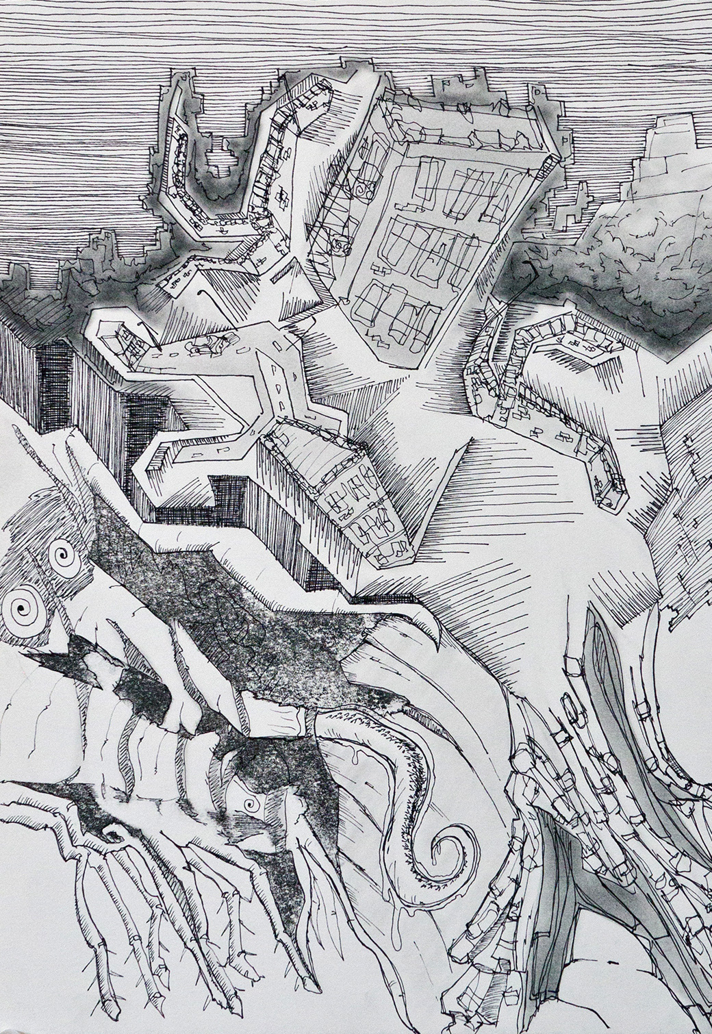 These drawings were created using a variety of mediums including graphite powder, ink, white gesso, print transfers, and charcoal on Stonehenge paper.