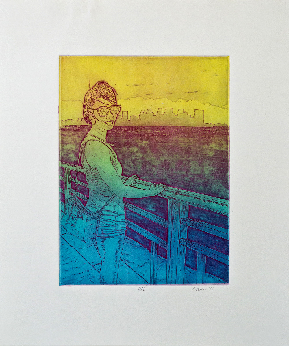 These prints were created through the use of the Intaglio printing process. The labor-intensive process includes acid-etching techniques such as hard ground engraving, aquatint, and sugarlift as well as the use of a printing press. Each print was drawn from family photographs taken during a visit to New York.