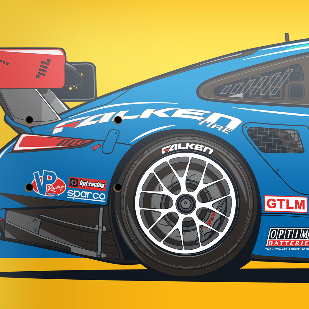 8-color digital illustration created for a potential promotional skateboard deck. Artwork features the Team Falken Tire #17 Porsche 911 RSR (991), driven by Wolf Henzler and Bryan Sellers. Unfortunately, Falken Tire decided to withdraw from IMSA before the skateboard could go into production.